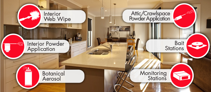 Interior powder application treats pest hiding places such as door and window frames, baseboards, wall plates and fixtures.